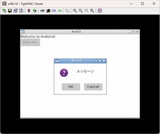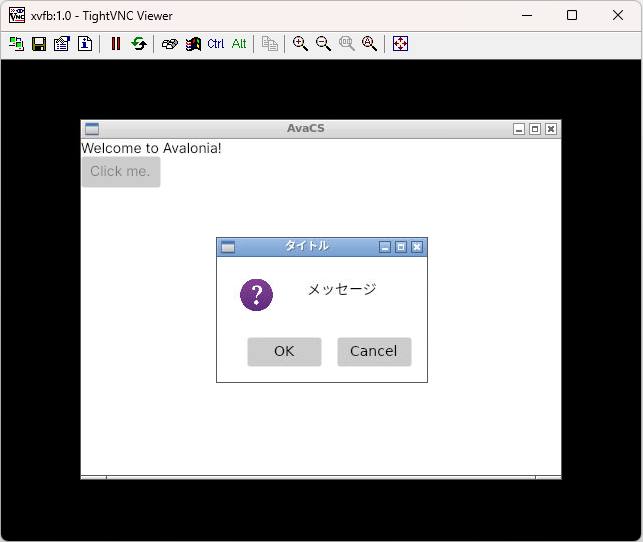 そのあと、Avalonia のテストプログラムを C# で作成し、Xvfb + VNC で実行します。