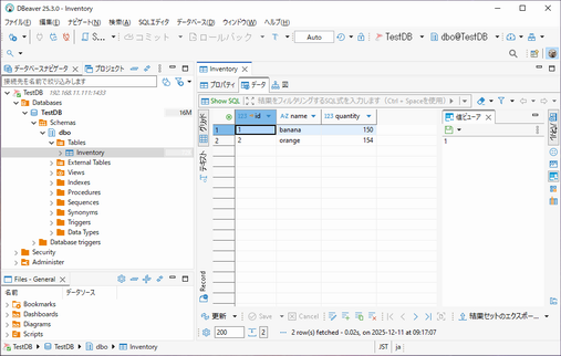 Windows PowerShell Copyright (C) Microsoft Corporation. All rights reserved. 新機能と改善のために最新の PowerShell をインストールしてください!https://aka.ms/PSWindows PS C:\> sqlcmd -S 192.168.11.111,1433 -U sa -P "Password123" -h -1 -No -Q "SELECT @@VERSION" ⏎ Microsoft SQL Server 2025 (RC1) - 17.0.925.4 (X64) Sep 9 2025 17:31:28 Copyright (C) 2025 Microsoft Corporation Express Edition (64-bit) on Linux (AlmaLinux 10.1 (Heliotrope Lion)) <X64> (1 行処理されました) PS C:\> sqlcmd -S 192.168.11.111,1433 -U sa -P "Password123" -d TestDB -No -Q "SELECT * FROM dbo.Inventory" ⏎ id name quantity ----------- -------------------------------------------------- ----------- 1 banana 150 2 orange 154 (2 行処理されました) PS C:\> exit ⏎