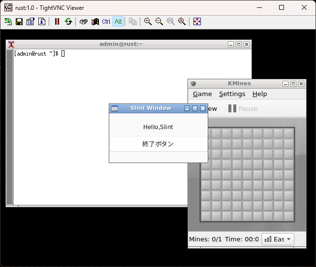 コンテナ OS (LXC) AlmaLinux release 9.7 (Moss Jungle Cat) AlmaLinux10 は Xvfb の環境に対応していない IP アドレス 10.0.3.20 lxc-net のアドレス VNC ポート 5901 Xvfb :1 にするとポート番号は 5901 になる Rust rustc, cargo 1.88.0 本稿記述時の最新版 GUI Slint 1.14.1 x11vnc 0.9.17 Xvfb 1.20.11 親 OS AlmaLinux release 10.1 (Heliotrope Lion) 本稿記述時の最新版