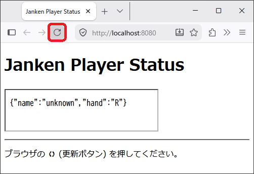 Windows PowerShell Copyright (C) Microsoft Corporation. All rights reserved. 新機能と改善のために最新の PowerShell をインストールしてください!https://aka.ms/PSWindows PS C:\> # WSL2 の Ubuntu に入る PS C:\> wsl ~ ⏎ who@pc:~$ cd ./ts/janken/ ⏎ who@pc:~/ts/janken/$ # じゃんけんプレイヤーに index.html を仕込む (*6を利用する) who@pc:~/ts/janken/$ mkdir -p ./public/ ⏎ who@pc:~/ts/janken/$ cat > ./public/index.html << EOF <!DOCTYPE html> <html lang="ja"> <head> <meta charset="UTF-8"> <title>Janken Player Status</title> </head> <body> <h1>Janken Player Status</h1> <iframe src="/hand" width=300 height=80></iframe> <hr> <p>ブラウザの 🗘 (更新ボタン) を押してください。</p> </body> </html> EOF ⏎ who@pc:~/ts/janken/$ # じゃんけんプレイヤーをひとつだけ起動する who@pc:~/ts/janken/$ node ./dist/player.js ⏎ -------------------------------------------------- Janken Server (Express) started on 0.0.0.0:8080 Environment MY_NAME: unknown -------------------------------------------------- [Hand Requested] From: 127.0.0.1:56996 -> Selected: R ^C ← 停止は をタイプする (下記 6-2 を実行後) who@pc:~/ts/janken/$ exit ⏎ logout PS C:\> exit ⏎