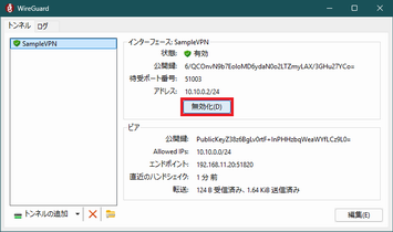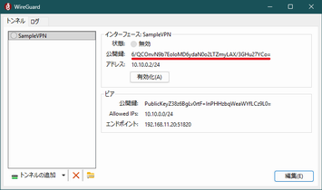 項目 内容 備考 名前(N): SampleVPN 当該ノードのトンネル名 Address = 10.10.0.2/24 当該ノードの IP アドレス [Peer] 接続する WireGuard サーバの定義開始 PublicKey = PublicKeyZ38z…Cz9L0= 上記 1-3 の wg show で確認した public key: の内容 AllowedIPs = 10.10.0.0/24 取り扱うネットワーク範囲 Endpoint = 192.168.11.20:51820 WireGuard サーバの IP アドレスと UDP ポート番号