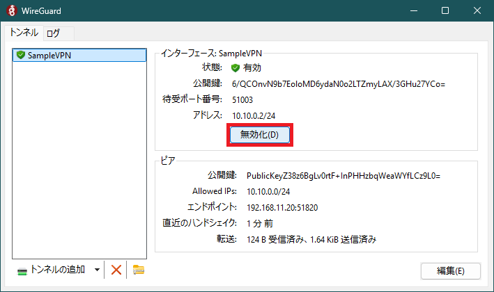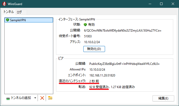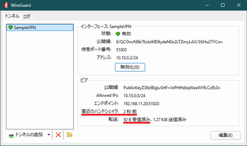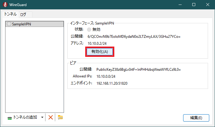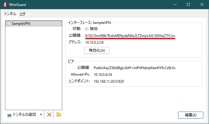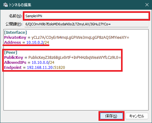 項目 内容 備考 名前(N): SampleVPN 当該ノードのトンネル名 Address = 10.10.0.2/24 当該ノードの IP アドレス [Peer] 接続する WireGuard サーバの定義開始 PublicKey = PublicKeyZ38z…Cz9L0= 上記 1-3 の wg show で確認した public key: の内容 AllowedIPs = 10.10.0.0/24 取り扱うネットワーク範囲 Endpoint = 192.168.11.20:51820 WireGuard サーバの IP アドレスと UDP ポート番号
