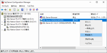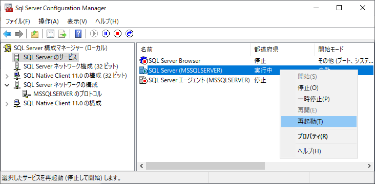 「SQL Server (MSSQLSERVER)」を右クリックし、「再起動(T)」を選択する。