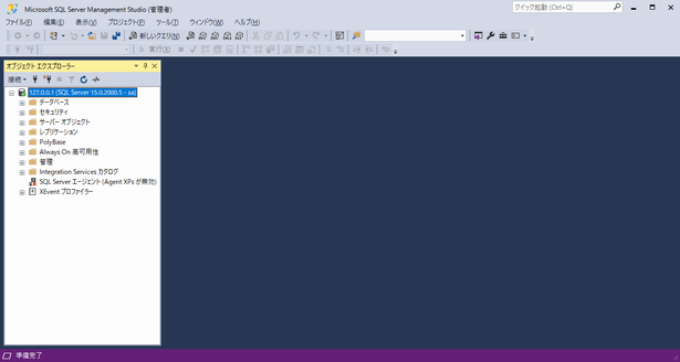 (オブジェクトエクスプローラーに接続先サーバ名が表示されている)