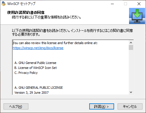 WinSCP v5.13.7 (本稿記述時の最新版) を窓の杜からダウンロードする。
